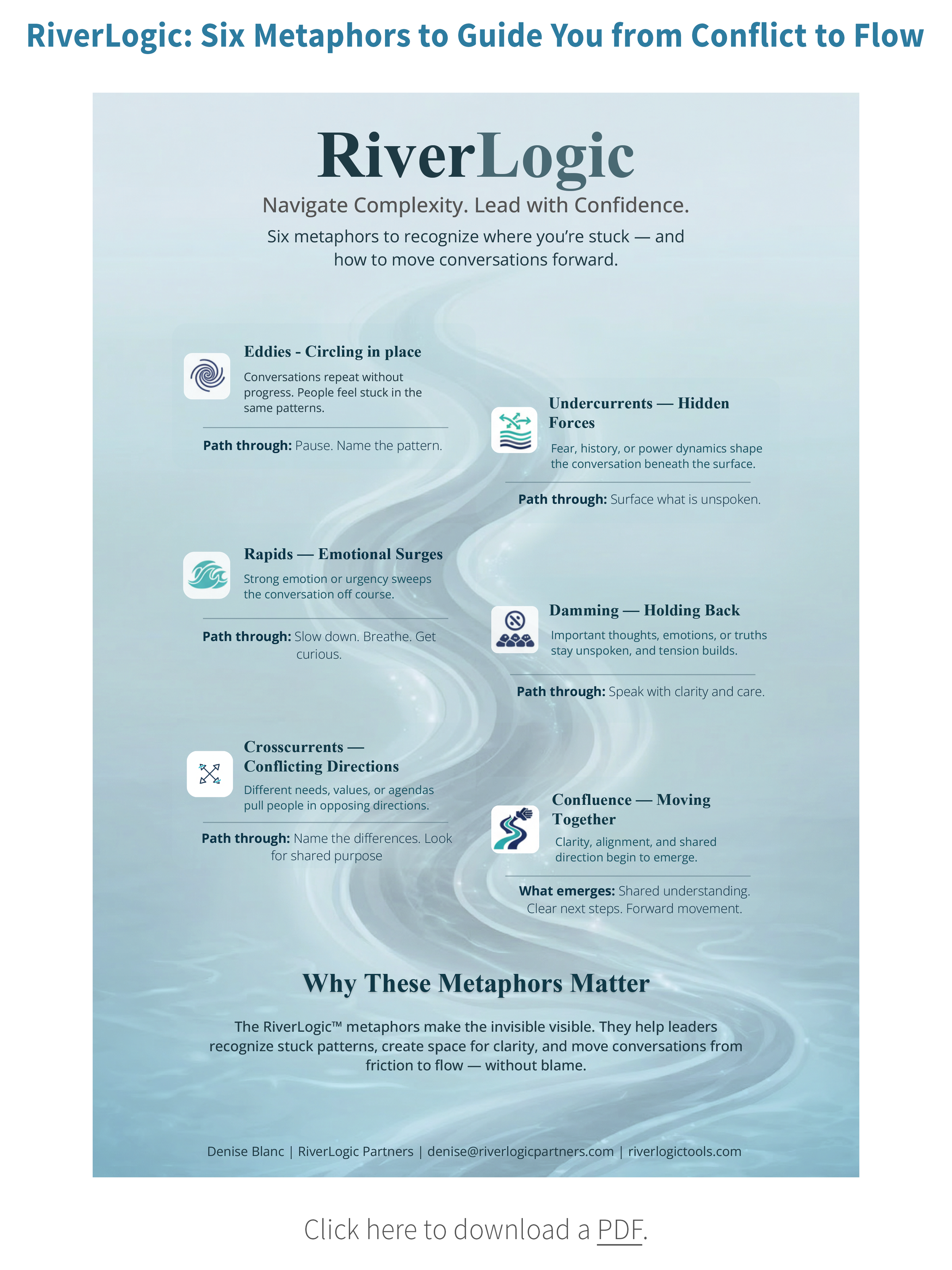 Blending personal stories, studies in Neuroscience, EQ, and Mindfulness, RiverLogic maps needed skills for communicating with more presence, resilience, and curiosity.